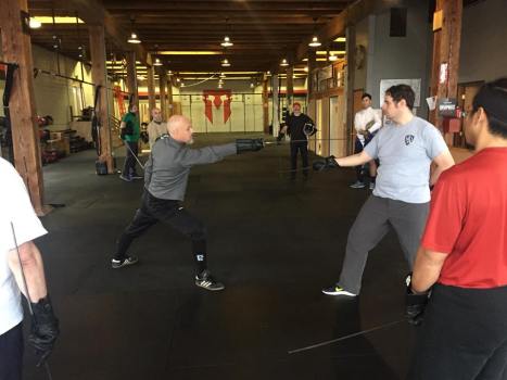 Previous Image Next Image Tim Duefrane, head of Herzstich Dueling Guild, and I demonstrating how to cut with opposition Dec. 2018, Herzstich Dueling Guild, Tacoma, WA, with Christopher Bigelow from Northwest Fencing Academy