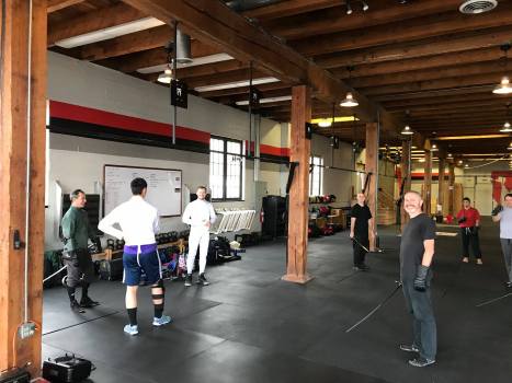 Previous Image Next Image Pre-seminar Warm-up Dec. 2018, Herzstich Dueling Guild, Tacoma, WA, with Christopher Bigelow from Northwest Fencing Academy