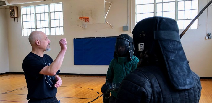 Previous Image Next Image Discussing head parries. March 2017 at IndesFG, Intro to Italian Sabre Seminar