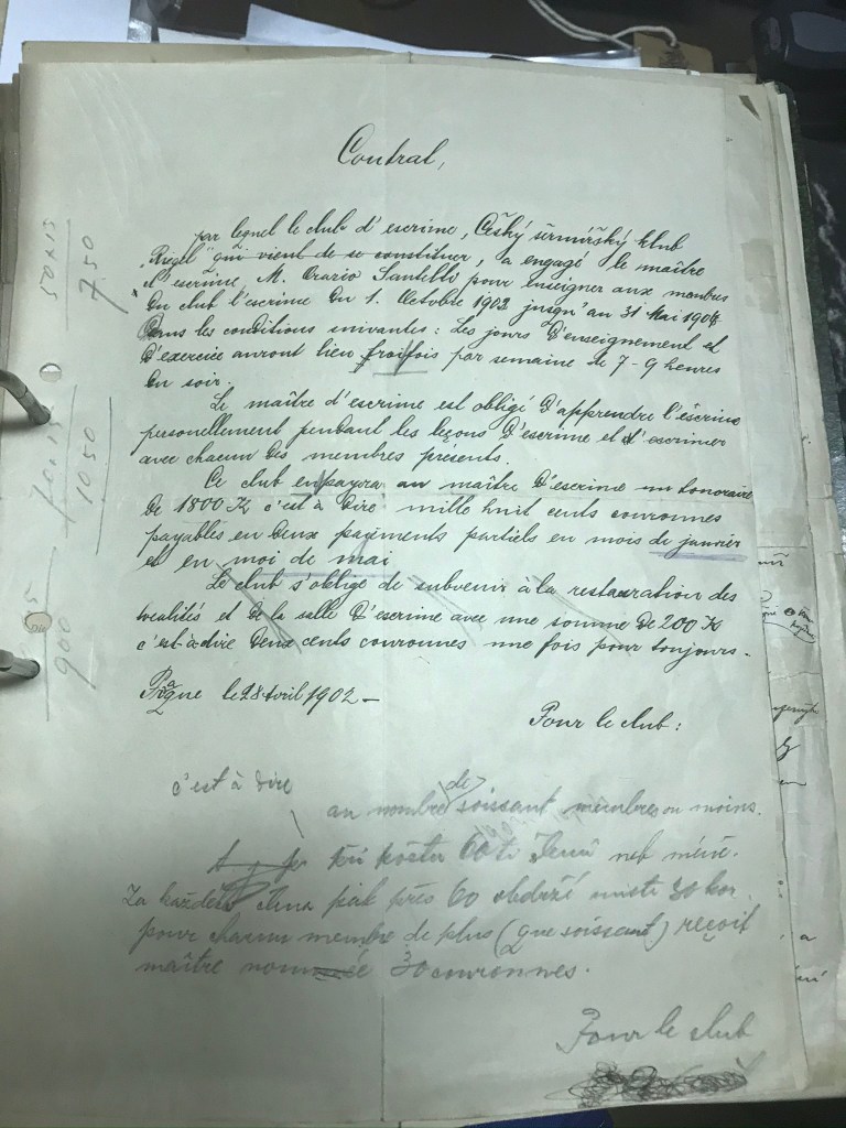 It’s difficult for me to describe the kinship I felt with him and many of the other fencers I met. My second evening in Prague Michael took me to one of the oldest clubs in Prague, Český šermířský klub Riegel (ČŠK Riegel) for a special treat. [4] One of the fencers there, a man who began at Riegel in 1949, Maestro Josef Šolc, manages the club archives and shared some of its treasures with us. There was the club charter penned in 1902 at a local pub, the contract that Italo Santelli’s brother, Orazio, had to teach at Riegel, and lists of members each year since the club’s founding, among many other gems. For the historian there was far more to these records than there might first appear. Czechia has witnessed much in its history, and in the 20th century experienced many of the major events, from Nazi occupation to Soviet control to liberation in 1989. These files document this history in a unique way. As a foreign visitor I can appreciate Czech history but cannot experience it; however, as a fencer in the tradition established by Radaelli’s students looking at these sources was to examine a shared heritage. This hit me powerfully. The maestro taking us through the archives, my friend explaining in English what each was, none of it felt foreign—we are brothers, part of the same family. These records document their branch of our shared tree. We often come to know people better through fighting them, but I’d add that sometimes it doesn’t take a visit to the piste to recognize one’s own.