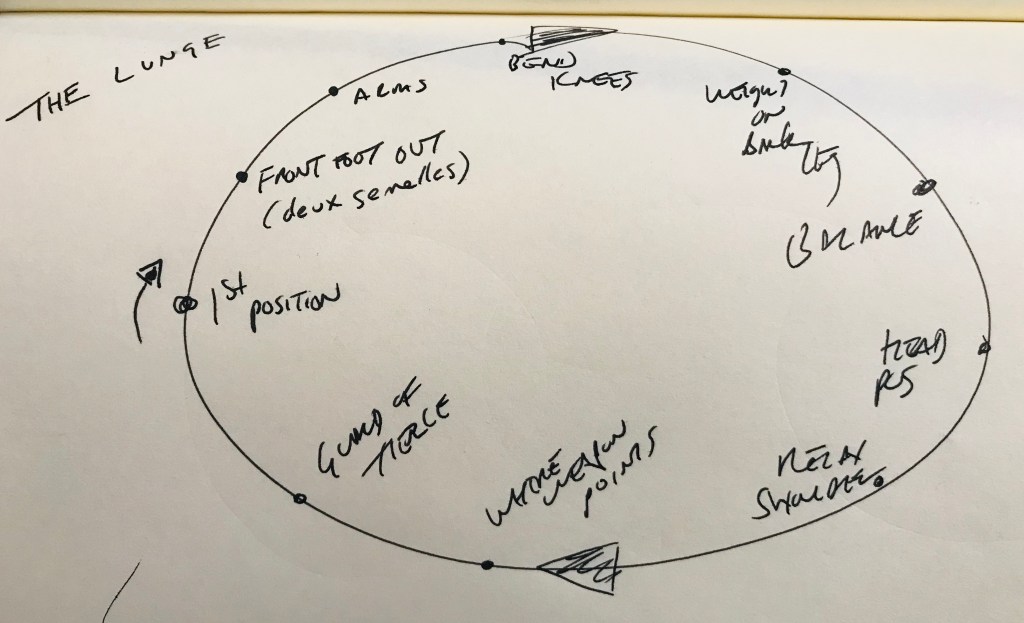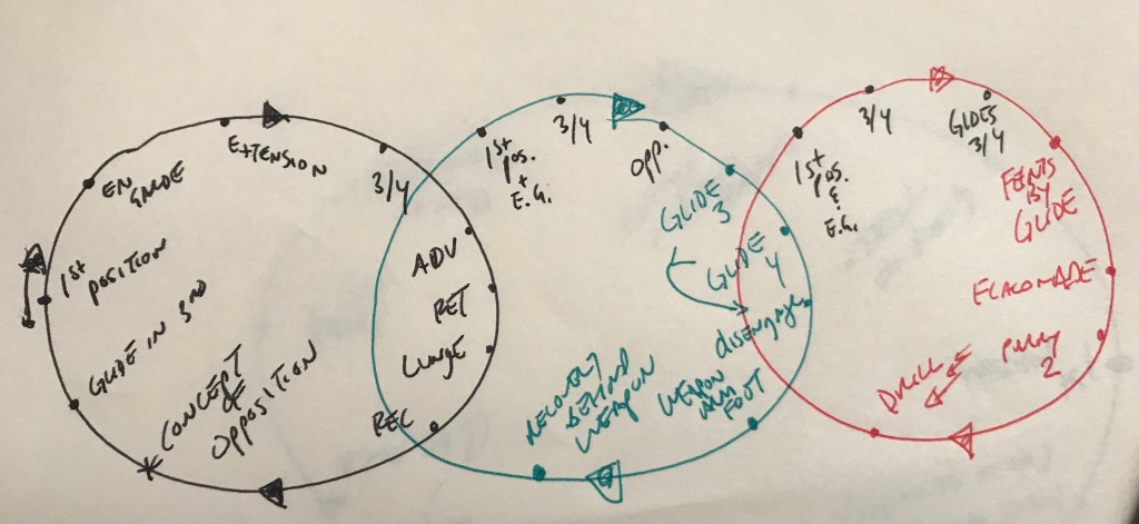 * My chicken-scratch is infamous, so here is a transliteration: –1. Black Circle: starting with 1st position, en garde, extension, guards/parries 3 and 4; movement: the advance, retreat, lunge, recovery out of the lunge; concept of opposition; glide in 3rd and defense –2. Green Circle: starting with review of 1st position and the en garde, guards 3 and 4, and opposition from first lesson; then the glide in 3rd, in 4th, and the disengage; importance of weapon-arm-foot; importance of recovering behind the point –3. Red Circle: review of 1st. pos. and en garde, guards 3,4, glides in 3/4; feint by glide in 3rd and 4th; flanconade; parry 2; drills building off of Fencer A makes feint by glide to outside line; Fencer B parries 3; Fencer A disengages, thrusts in 4th with opposition–> Fencer B receives the touch; then, same set-up, but Fencer B parries 4th and ripostes by flanconade [this sets up a future lesson were Fencer A will parry in 2nd]