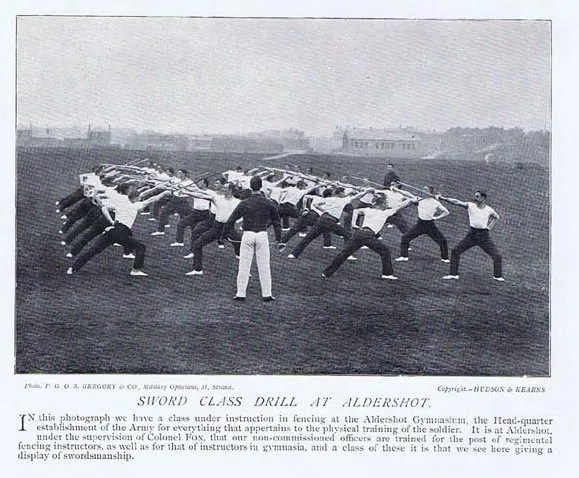 [4] We see use of the lean in other systems–this image from Aldershot, for example, would suggest the influence of Masiello on the 1895 English Infantry Sabre Exercise. NB: Radaellian sabre was split into three expressions–mounted practice, drill as if mounted but on the ground, and, on foot, the latter intended for combat as well as the growing agonistic sphere. What does “unmounted cavalry drill look like?” Like this: