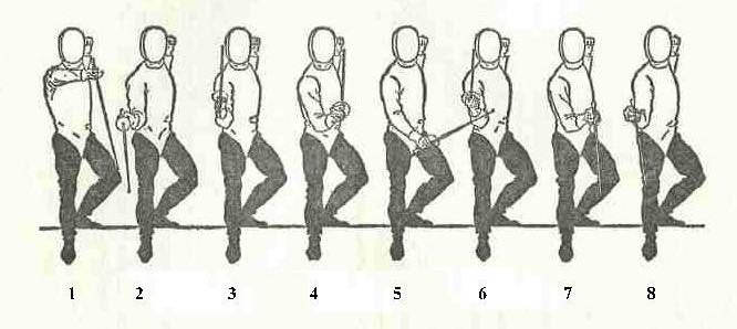 In order to hold your sword well, the hilt must be flat in your hand; so that the two edges will be nearly horizontal when you throw yourself upon guard; your thumb stretched along the upper flat part of the hilt, within half an inch of the shell, and the pummet is to rest under your wrist. [p. 3]