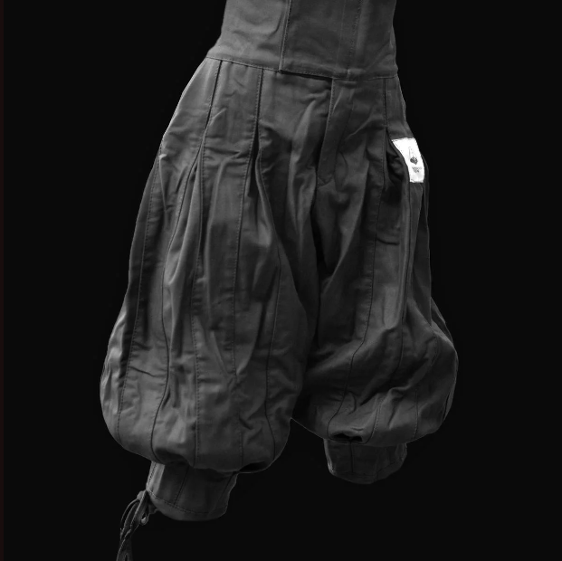 The material is a tough canvas and the seams are reinforced, an important consideration in fencing pants. I was relieved to see that the pant legs sport larger openings for the lower legs. In the past I’ve burst seems on fencing knickers, and I’m not particularly muscle-bound. The ties, which for me, fall just below the knee, did not come undone once. Sizing is a bit more fluid than one might expect, but this was not a problem and I doubt would be for most people–so long as one picks the closest size, something Jay is happy to assist one with, the fit is adjustable thanks to cinches on the side of the belt-line, suspenders, and a wide, comfortable Velcro closure where one normally finds a zipper.