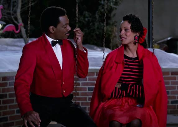 Prince Akeem (Eddie Murphy) sitting rigidly in “Coming to America” (1988)