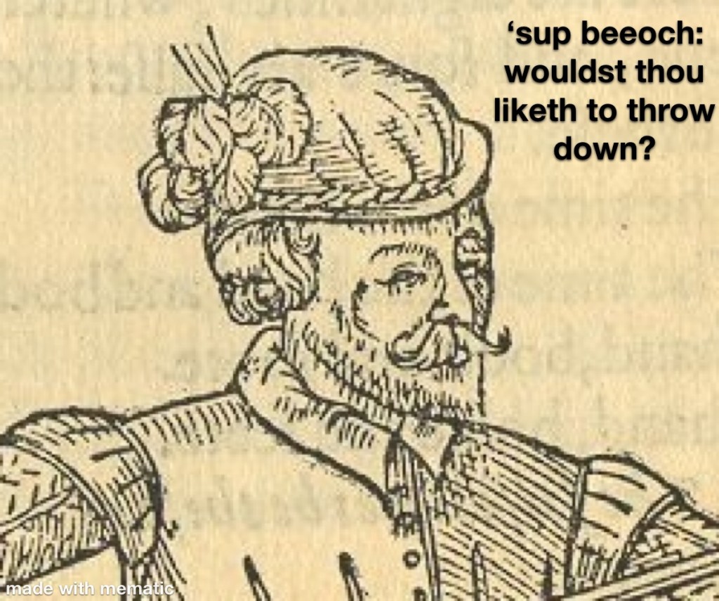 Much of what and how we teach comes down to goals. It’s not my intention to disparage any one rule-set or fencing culture; people pursue what appeals to them and that’s fine. If tag is your thing, go for it. What I will say, however, is that for those of us ostensibly teaching historical fencing, a major goal is approaching everything as best we can as if the weapons were sharp, so we must pay some attention to inculcating an awareness of danger however artificial. It’s sort of, well, the point (pardon the pun) of what we’re doing. [5]