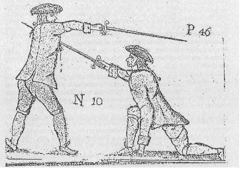 Hà portato il Pugnale avanti, coprendosi tutte le parti superiori, di modo che il nemico vedesolo per bersaglio da colpire il petto per le parti di sotto il Pugnale [Marcelli, Regole della Scherma, Lib. I, Cap. III, 4]